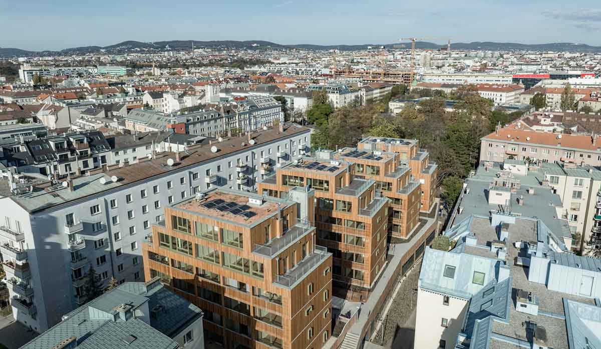 Holz kommt immer häufiger beim mehrgeschossigen Bauen zum Einsatz. Dieser Wohnbau mit 85 Wohnungen umfasst vier Baukörper mit sechs und sieben Etagen.