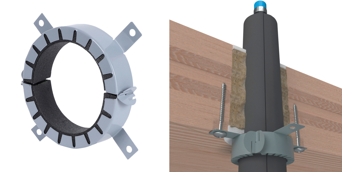 Für größere Rohrdurchführungen in CLT-Wänden und -Decken sowie Holzbalkendecken ist die intumeszierende Brandschutzmanschette ohne zusätzliche Laibung einsetzbar.