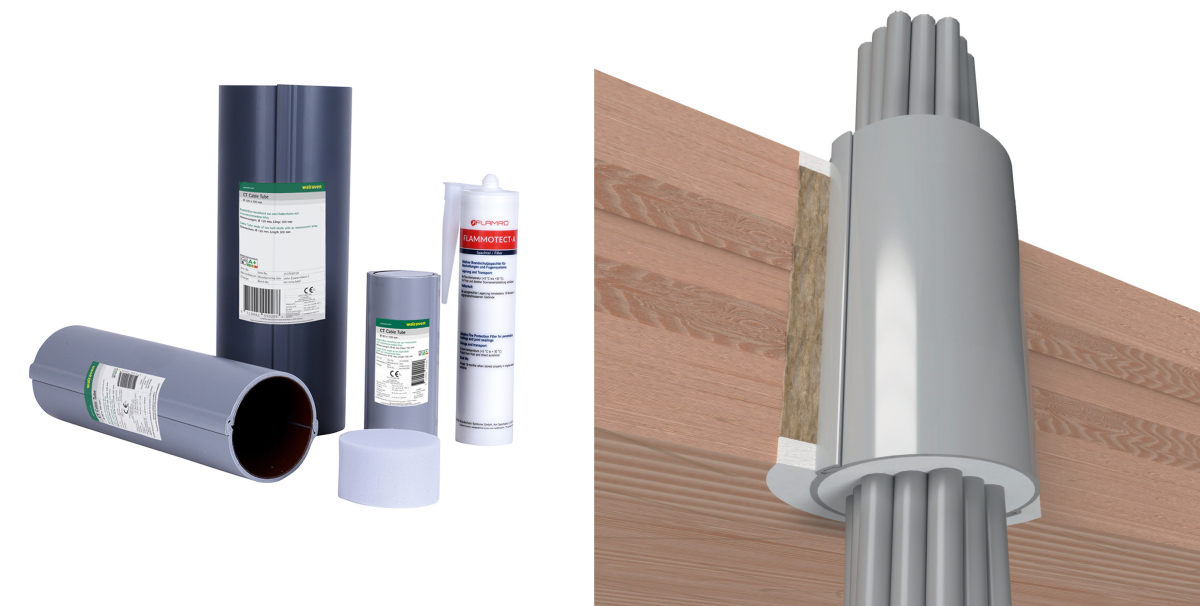 Die Brandschutzröhre ist speziell für Kabel und kleine Rohre in CLT-Bauteilen geeignet und eine Nachbelegung ist problemlos möglich.