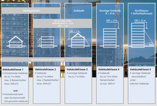 Einteilungskriterien für die in den Bauordnungen unterschiedenen fünf Gebäudeklassen.