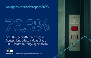 Laut Anlagensicherheitsreport sind im Jahr 2025 weitere 64,7 % der geprüften Aufzüge mit „geringfügigen Mängeln“ beanstandet worden. Das sind 4,2 Prozentpunkte mehr als im Vorjahr und 21,6 Punkte mehr als im Jahr 2023. Grund für den starken Anstieg sind vor allem Defizite bei der Cybersicherheit der zunehmend digital gesteuerten Anlagen. Die Betreiber sind seit mehreren Jahren dazu verpflichtet, entsprechende Schutzmaßnahmen umzusetzen und diese zu dokumentieren. Fehlt ein entsprechender Nachweis bei der Prüfung, führt das zu einem geringfügigen Mangel. „Die Gefahr von Cyberangriffen auf vernetzte Anlagen der Gebäudetechnik ist sehr real“, sagte Bühler. „Hersteller und vor allem Betreiber sollten die Cybersicherheit ernst nehmen und ihren Pflichten nachkommen. Damit leisten sie einen Beitrag zur Resilienz der technischen Infrastruktur in Deutschland.“ Insgesamt waren im Jahr 2025 gut drei von vier Aufzugsanlagen (76,3 %) mangelbehaftet – ein historischer Höchststand.