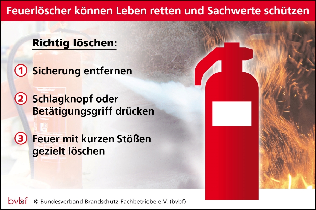 Für einen umfassenden Brandschutz empfiehlt der bvbf auch in Hausfluren und Treppenhäusern größerer Wohngebäude Rauchwarnmelder anzubringen, da diese häufig mit Kinderwagen, Fahrrädern und sonstigen leicht brennbaren Gegenständen bestückt sind. Zur aktiven Bekämpfung sollten zudem alle Wohnungen und insbesondere angeschlossene Flure von Treppenhäusern mit tragbaren 6-l-Feuerlöschern, gefüllt mit Schaum oder Wasser, ausgestattet werden. Für Küchenbereiche sind nur spezielle Fettbrand-Feuerlöscher geeignet. Denn schlägt der Rauchwarnmelder Alarm, lässt sich der Brand mit einem Feuerlöscher in der Entstehungsphase oft löschen oder zumindest eindämmen.