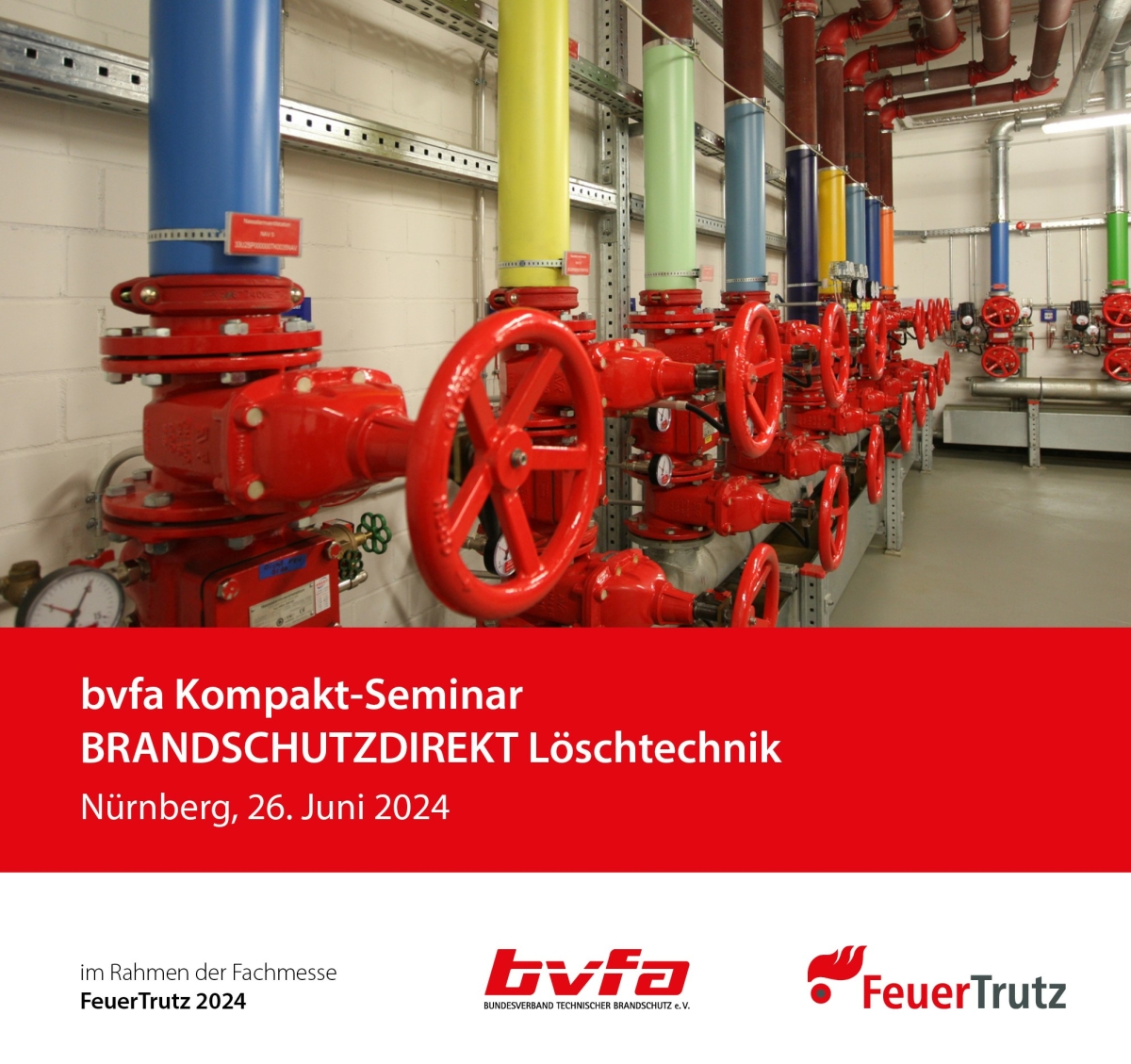 Die Schwerpunkte des gemeinsamen Kompakt-Seminars „Brandschutzdirekt Löschtechnik“ vom Bundesverband Technischer Brandschutz e.V. (BVFA) und FeuerTrutz am Mittwoch, 29. Juni, in Nürnberg liegen in der Information und Wissensvermittlung zu aktuellen Fragestellungen des anlagentech-nischen Brandschutzes. Neben den Neuerungen in den Regelwerken (NFPA 13 und VdS) geht es um das Schaumlöschmittel und das Verbot von Fluortensiden. Weitere Schwerpunkte des Tages sind Themen wie Hochdrucklöschanlagen oder auch das Zusammenwirken von Sprinkleranlagen mit Rauch- und Wärmeabzugsanlagen. Es ist unbestritten, dass versicherungstechnische Forderungen im Hinblick auf Feuerlöschanlagen den Markt in Deutschland intensiv bewegen. Daher sei es den Veranstaltern wichtig, Hintergründe zu dieser Fragestellung aufzugreifen.